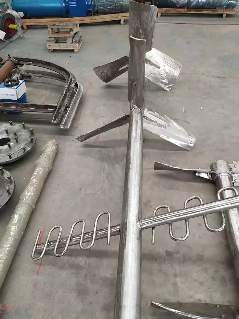 The stainless steel agitator with toothed blades has an impeller speed of over 1500r/min and has the function of dispersing powder and crushing solid particles. The spiral impeller rotates at a speed of tens to hundreds of revolutions per minute, generating strong axial flow; Anchor the impeller to rotate at a low speed of 10 to tens of revolutions per minute, transferring the liquid in the tank to the high shear zone caused by the impeller and the axial flow zone formed by the helical impeller. Due to the non coincidence of the three rotational axes of the impeller, it is called a non coaxial combined mixing device.